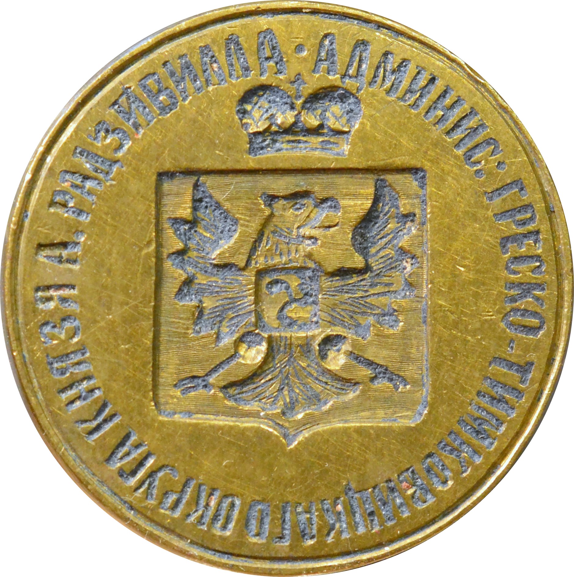 Il. 12 . Matryca tłoka pieczęci Zarządu Dóbr Hresko-Tymkowickich Antoniego księcia Radziwiłła, XIX w., Ø 35 mm