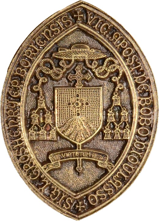 | 10 | W polu pieczęci, oddzielonym od pola legendy podwójnym obrzeżeniem ciągłym, na tarczy pagórek, na nim perełkowy krzyż z promienistą glorią. Za tarczą krzyż procesyjny w słup. Powyżej kapelusz rangowy ze sznurami, węzłami i chwostami po sześć z każdej strony. Poniżej tarczy szarfa z dewizą PER VIRTUTEM CRUCIS (pol. Przez moc Krzyża). Na zewnątrz, wokół pola legendy, podwójne obrzeżenie ciągłe. |