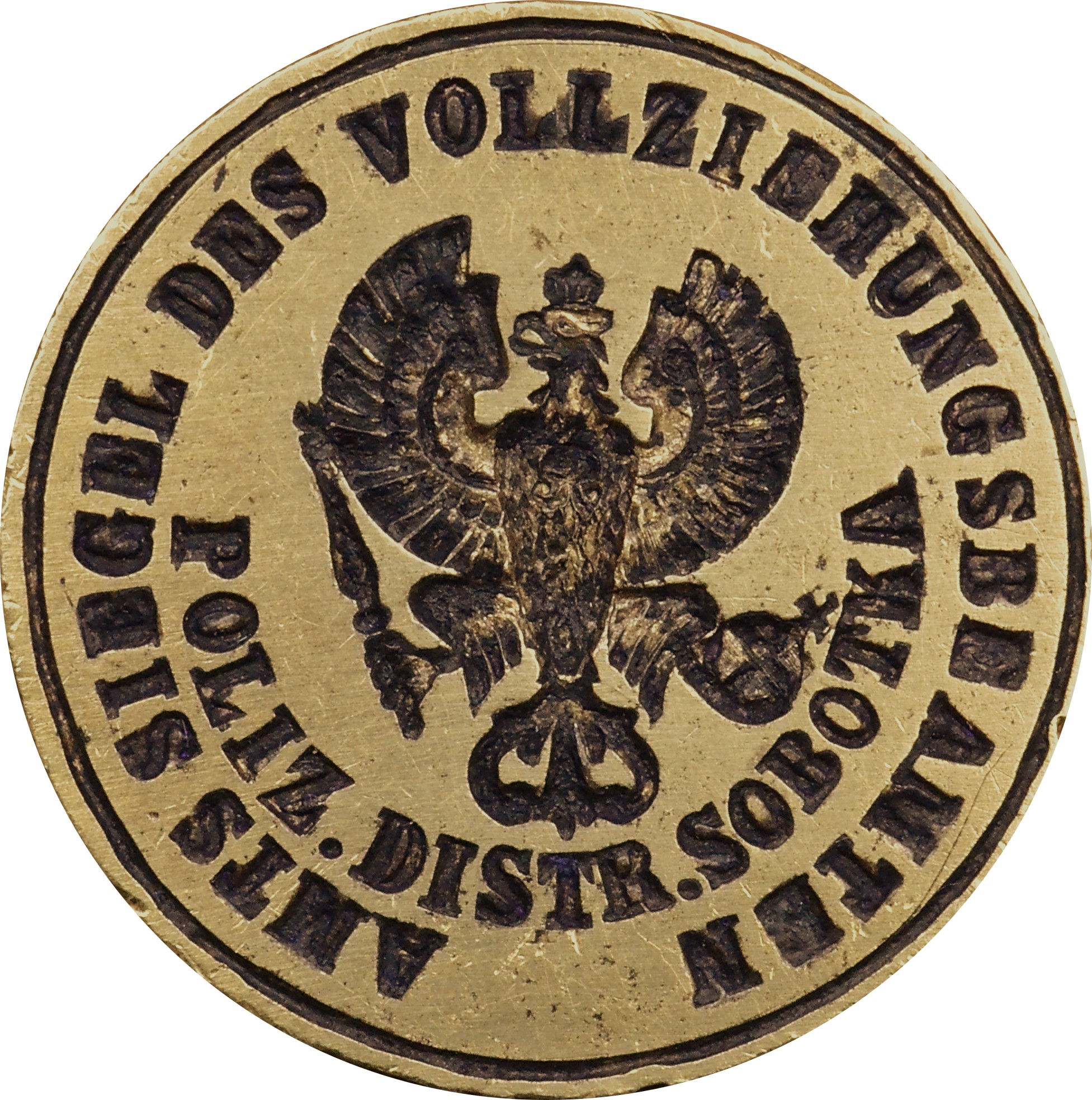 | 9b | w otoku: AMTS SIEGEL DES VOLLZIEHUNGSBEAMTEN w polu (w półotoku poniżej wizerunku): POLIZ(ei) DISTR(ikt) SOBOTKA |