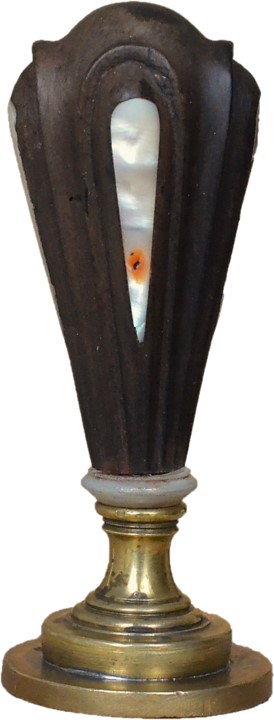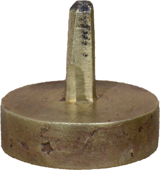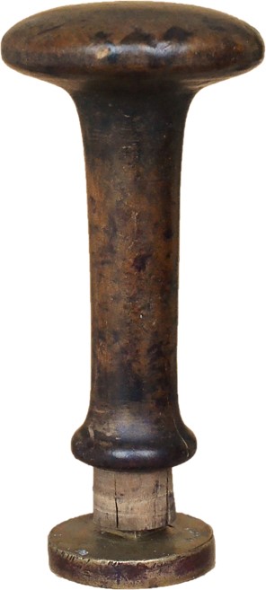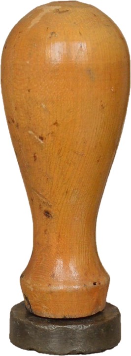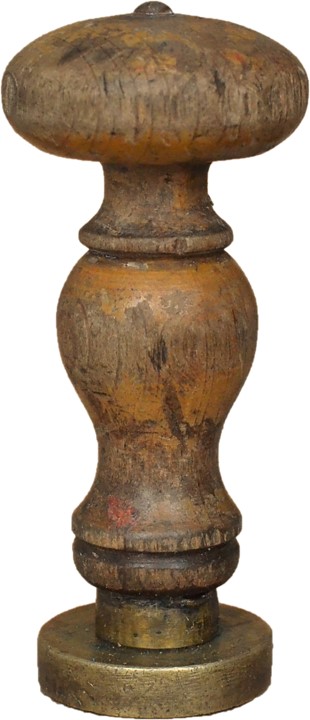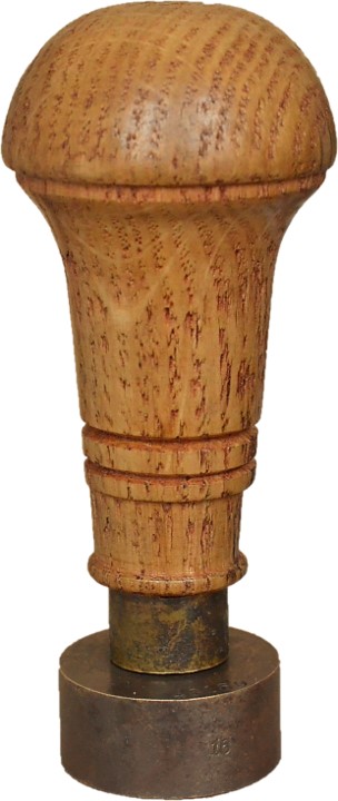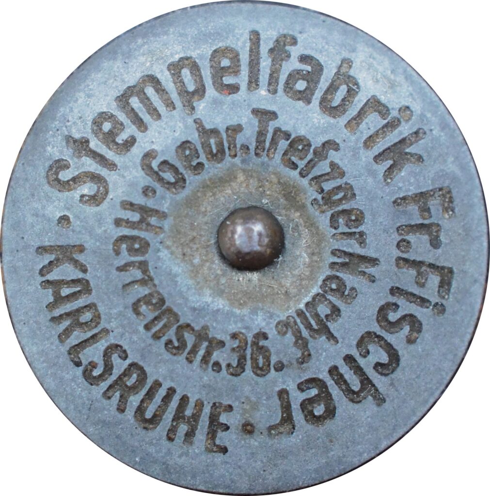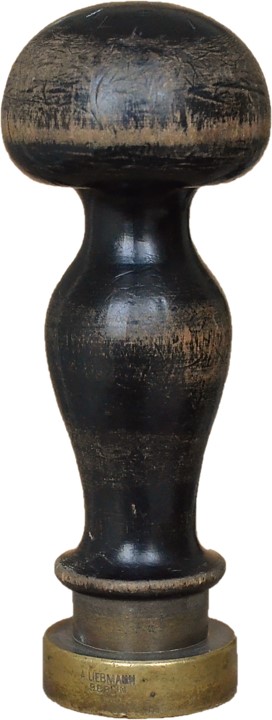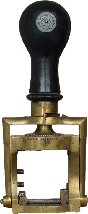 | 7 | matryca osadzona w mechanizmie sprężynowym, uchwyt toczony o kulistej gałce, lakierowany na czarno, na gałce pineska z sygnaturą wytwórcy; w pierścieniu zewnętrznym: Stempelfabrik Fr. Fischer // KARLSRUHE, w pierścieniu wewnętrznym: Gebr. Trefzger Nachf. // Herrenstr. 36. |
