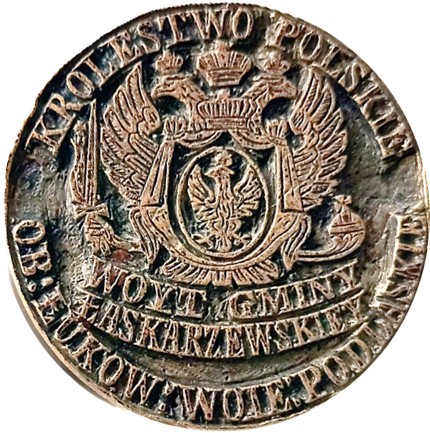 | 9b | w półotoku górnym: KRÓLESTWO POLSKIE w półotoku dolnym: OB(wód) ŁUKOW(ski) WOJE(wództwo) PODLASKIE w polu (poniżej wizerunku): WOYT GMINY // ŁASKARZEWSKIEY |